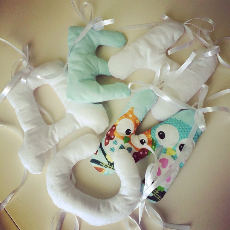 Именные гирлянды и панно, рамки для фотоНежная мятно-белая гирляндочка выполнена на заказ. Высота букв - 14 см, использовались хлопок 100% и синтепух.