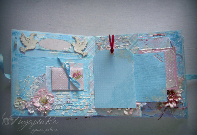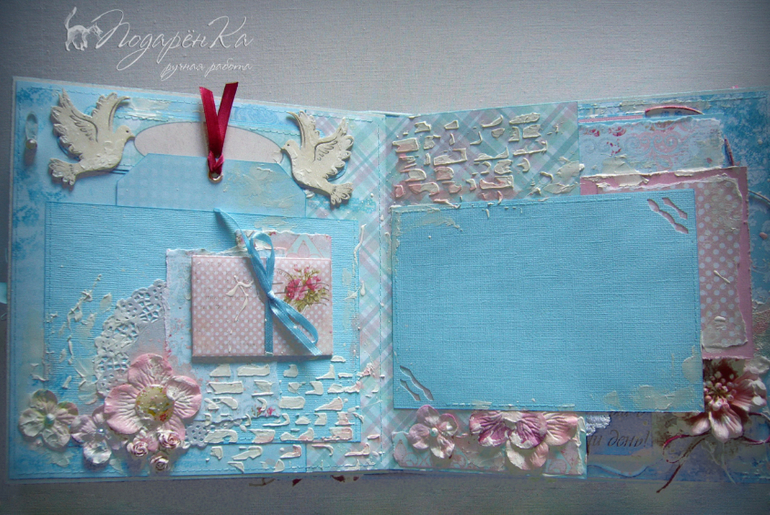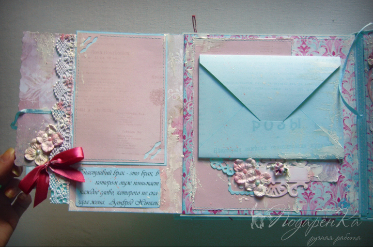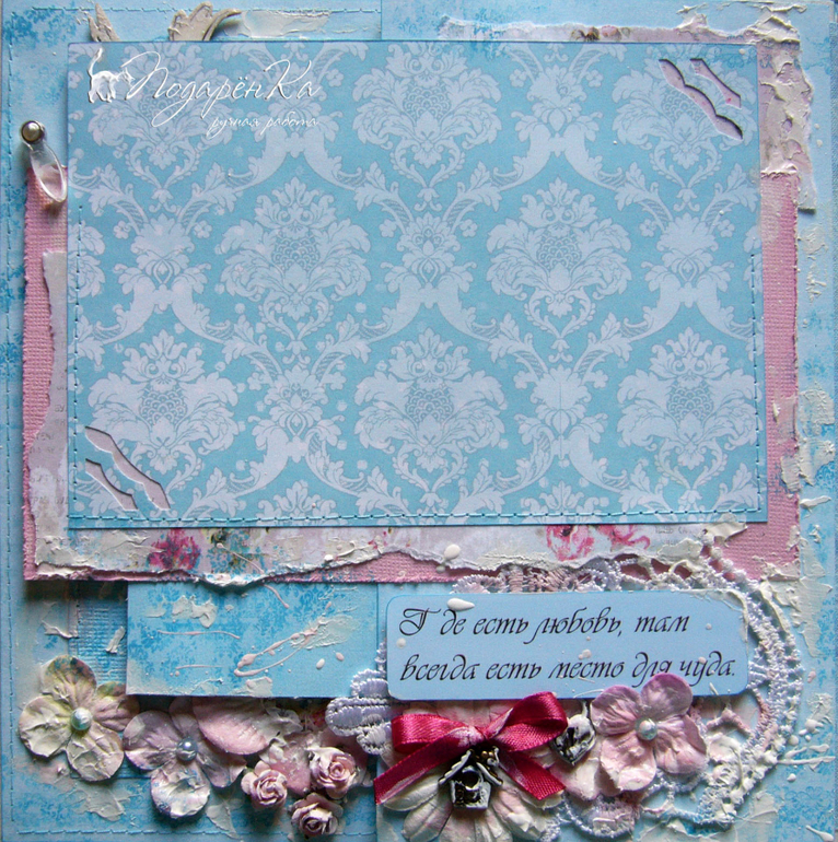 Скрапбукинг (альбомы, открытки и пр.)Альбом ручной работы с элементами Миксмедиа (21*21 см). Мягкая тканевая обложка, переплет, 8 страниц, подложки для фото, карман, конверт для фото, открывающиеся элементы. Под катом фото и видео, приятного просмотра)