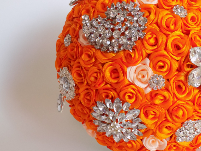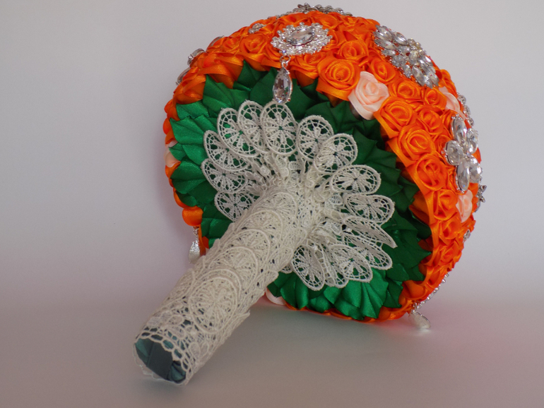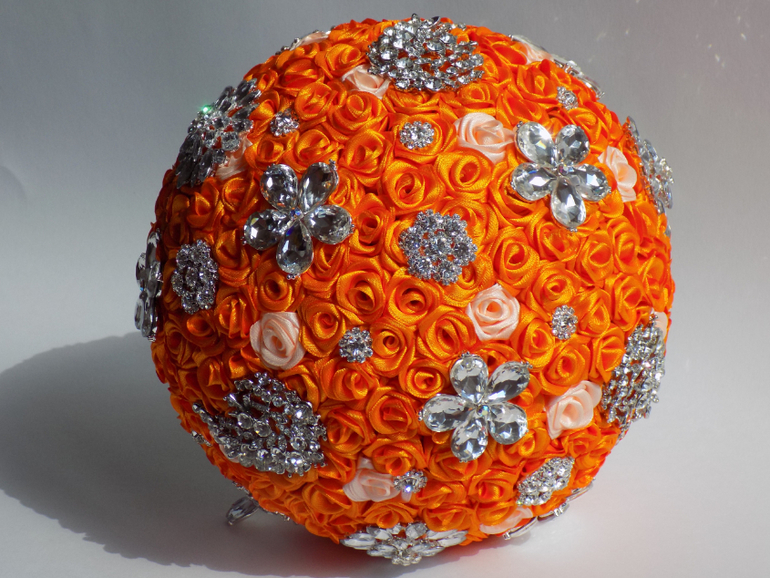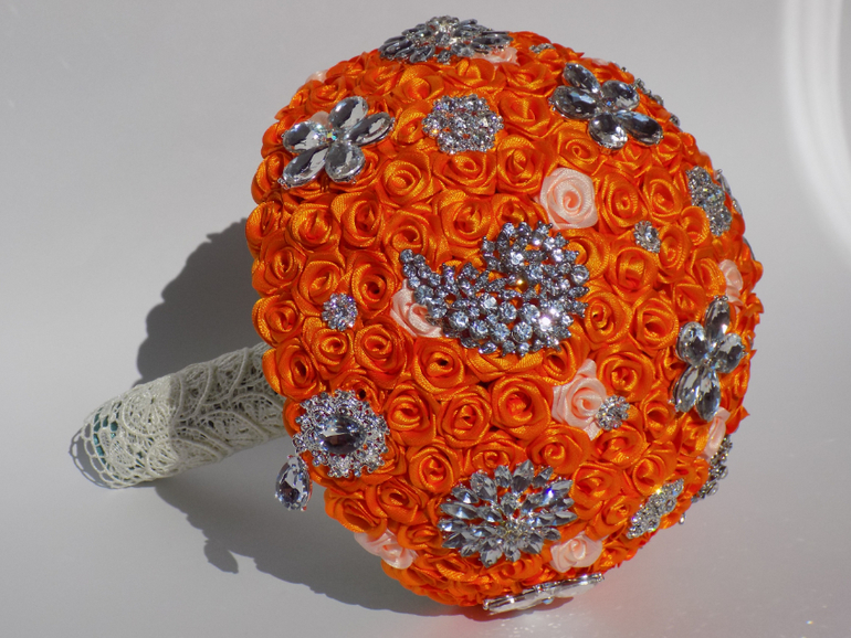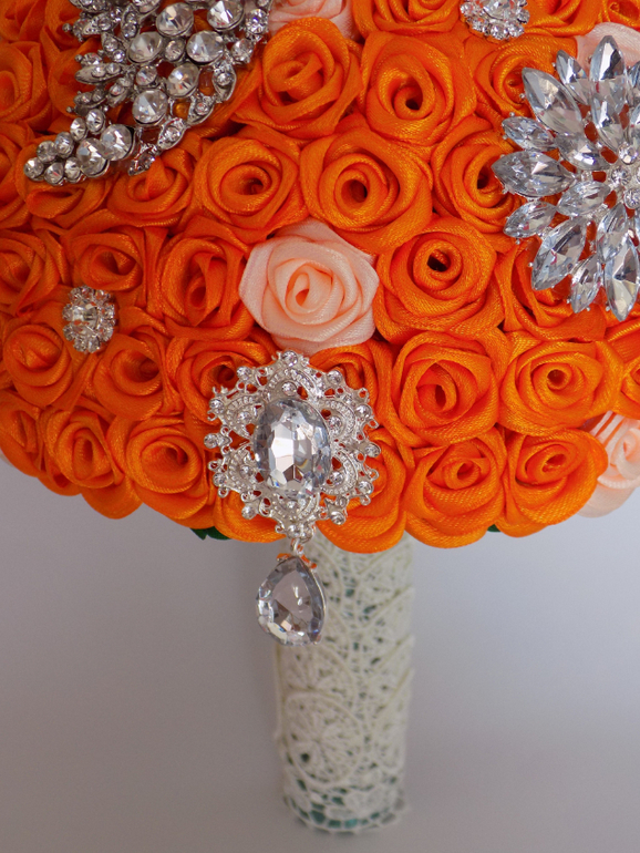 В букете более 200 бутонов розочек и около 30 брошей с кристаллами. Он эффектно выглядит вживую, на солнце блестит и переливается. Возможно изготовление в различных цветовых гаммах из разных цветов и с разными брошками.