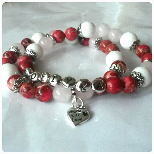 Браслеты с именами выполнены из натуральных камней (азурит, коралл, агат, лазурит, яшма, аквамарин, варисцит, нефрит, лунный камень, кварц, шунгит, гематит и т.д.) с использованием качественной оригинальной фурнитуры производства США с золотым или серебряным покрытием. Все украшения выполняются на заказ.