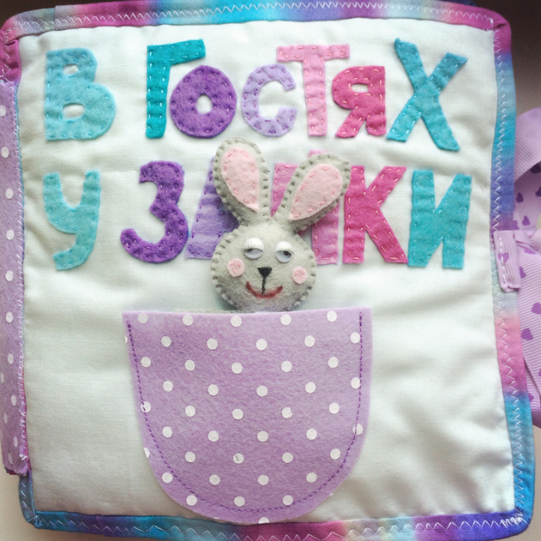 это пример книги в переплете. Главный герой зайка, с "живыми" глазками. Зайку можно переодевать, мыть в ванне и чистить зубки, укладывать спать и кормить.