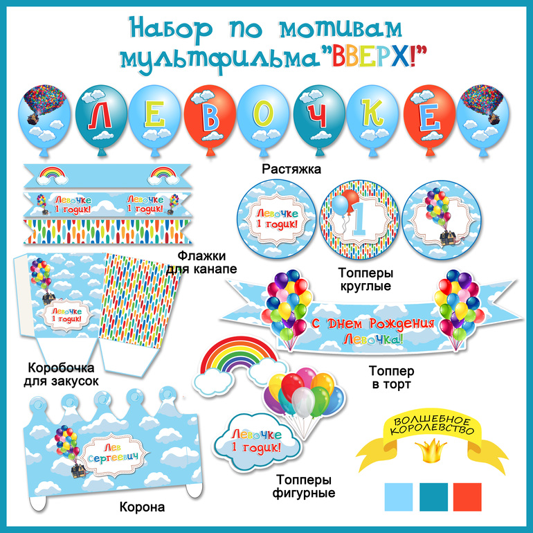 Оформление праздников, аксессуары для фотосессийПредставляем вам набор по мотивам мультфильма "Вверх!" и конечно же именной постер. Напоминаем, что дополнить набор можно любыми другими элементами из нашего прайса