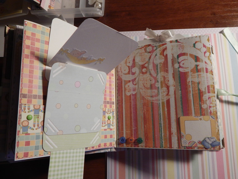 Сотворился чудный мини-альбомчик. Размер 16*17. На каждой страничке место для записи. Сами странички сделаны как кармашки, внутри каждого дополнительный тэг, который можно использовать для фотографии или для записей памятных дат и интересных моментов из жизни Вашего сыночка. На большинство страничек альбома фото не обязательно вклеивать, их можно просто закреплять под декоративными элементами! Также есть конвертик, например, для локона или какой-то записочки.Разместить можно порядка 20 фотографий формата 10*15 и 20 фотографий меньшего формата.