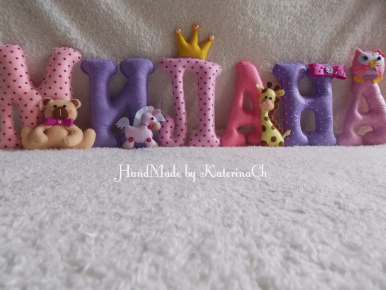 Для одной принцесски буковки высотой 10 см, в розовой гамме, украшены зверушками из фетра, крепление "все буковки отдельно".