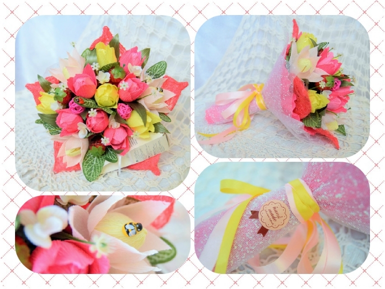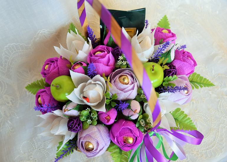 Все конфетки легко вытащить, некоторые букеты дополнены чаем. Композиции в корзинах можно упаковать в прозрачную пленку, в любом случае букет поставляется в бумажном пакете.