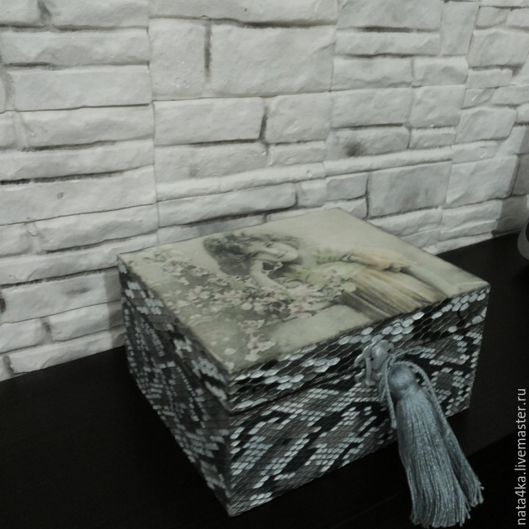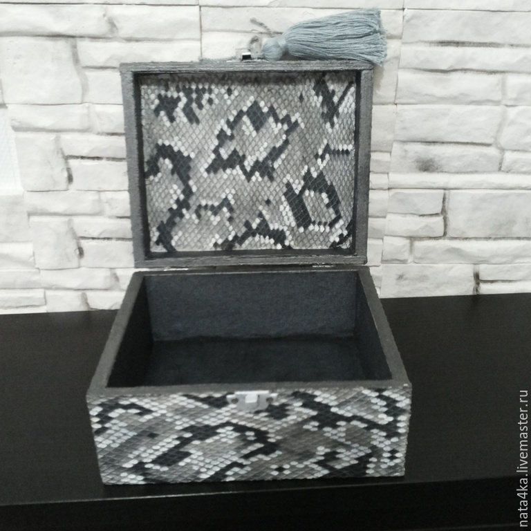 Шкатулка "Змеиный принт" выполнена в технике декупаж, имитация кожи змеи. Размер 18х15 высота 6см.