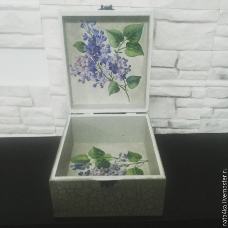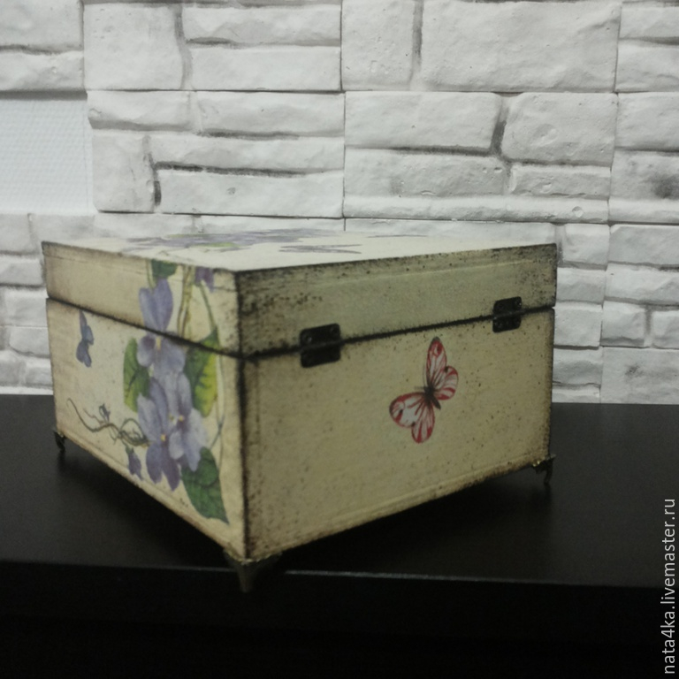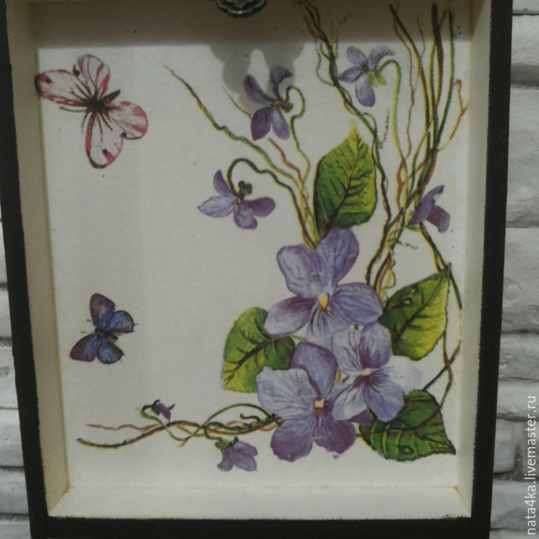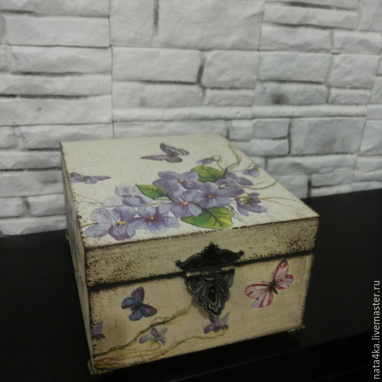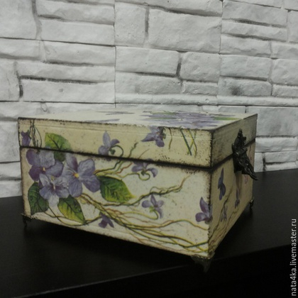 Шкатулка "Фиалки" выполнена в технике декупаж, деликатно состарена. Размеры 18х15 высота 6см.
