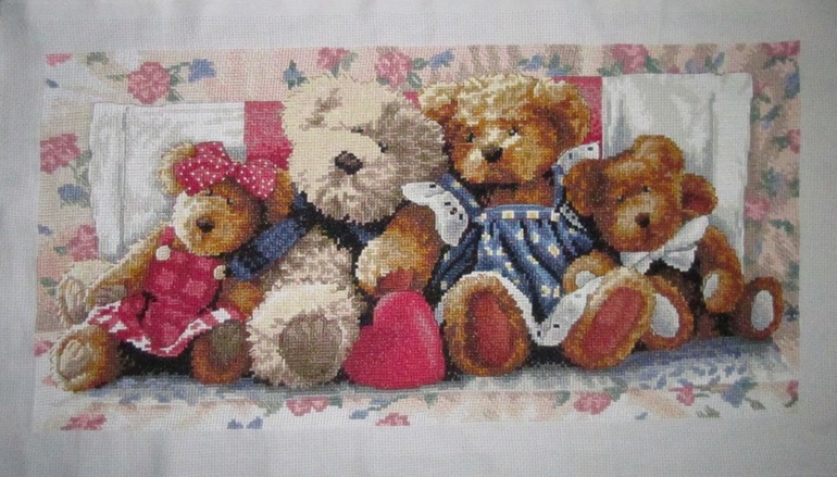 Семья мишек,на фото отшив по такому же набору.Канва с нанесенной схемой,которая смывается после стирки.№ канвы-11.
