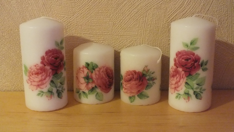 ДекупажСделались вот такие свечки в технике декупаж, безумно понравилось их делать, качетво фото плохое извеняйте