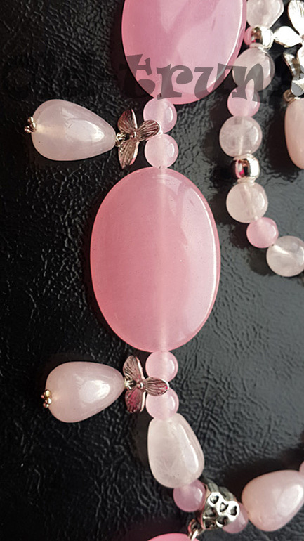 Выполнен из бусин розового кварца различного оттенка, овальные камни 3,5 смХ2,5 см насыщенного розового цвета, металла, швензы серёг и штифты- серебро, замок магнитный