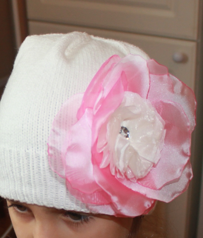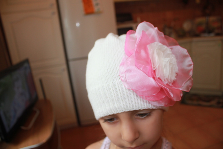 Вяжу на продажу и обменНовая шапка самовяз на девочку 5-6 лет.Цветок съемный - крепится кнопкой.