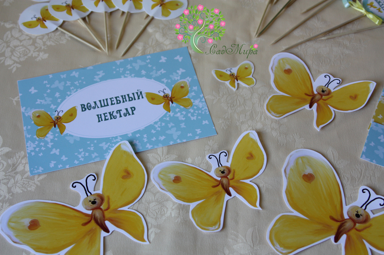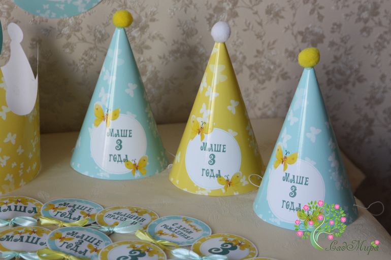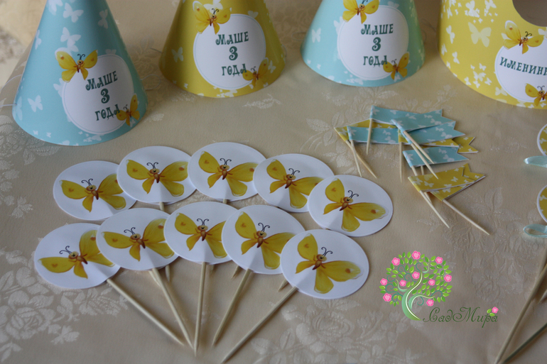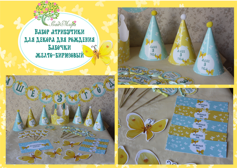 Оформление праздников, аксессуары для фотосессийНабор атрибутики для декора дня рождения "Бабочки" (Желто-бирюзовый).