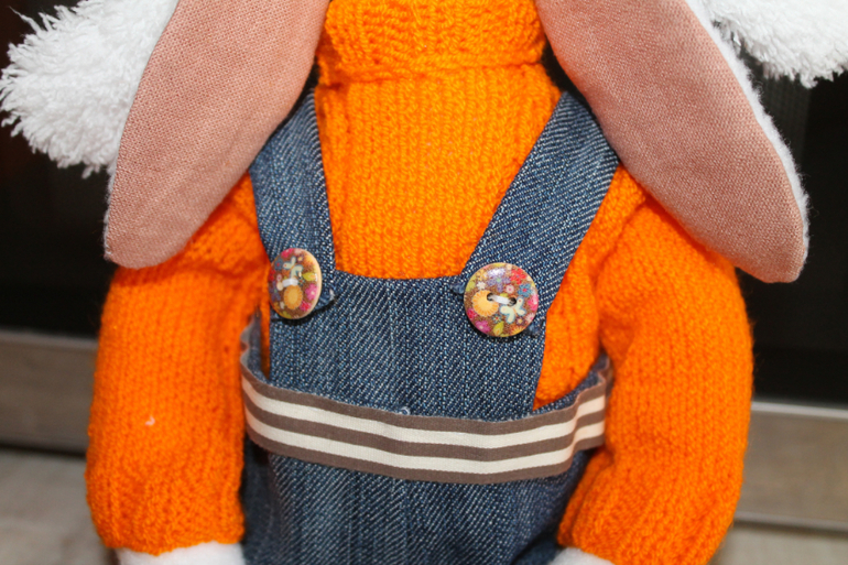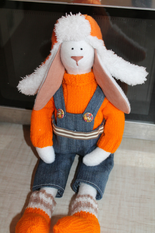 Куклы и игрушкиЗайчик Сёма. В теплом вязаном свитерочке, носках и шапочке-ушанке. В джинсовом комбезе. Сёмочка ищет себе хозяина или хозяйку)