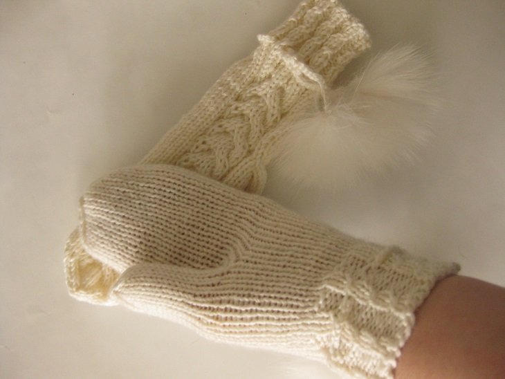 Тёплые ( связаны в две нитки) варежки из полушерстяной пряжи. Манжета выполнена резинкой с переплетениями , а по центру широкая коса. Меховые помпоны на шнуровке, что позволяет без проблем стирать данное изделие.