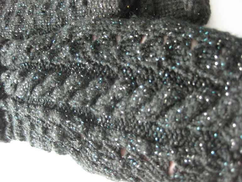 Вяжу на продажу и обменЧуть удлинённые, обвязан большой палец. Вязка фактурная: полосы ажура и узор "косичка". Декор в виде объёмного цветка с серебристой бусиной.