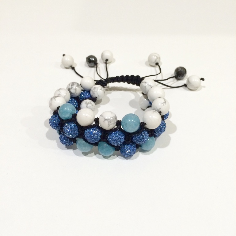 1. Браслет тройной с натуральными камнями (кахолонг, аквамарин, гематит) и бусинами со стразами - 900р.