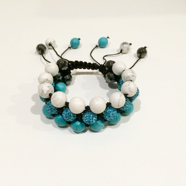 2. Браслет тройной с натуральными камнями (кахолонг, бирюза, гематит) и бусинами со стразами - 900р.