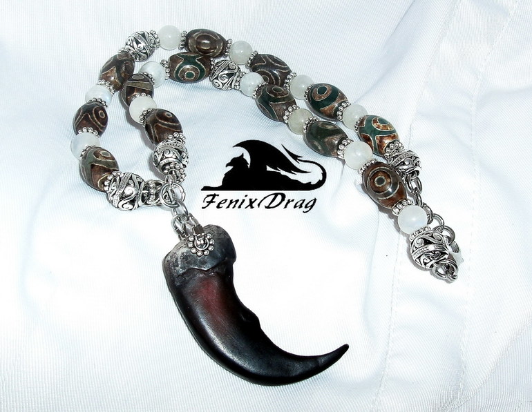 искусственный (синтетический) коготь медведя Гризли, натуральный тибетский состаренный агат с ручной росписью, натуральный лунный камень - адуляр, фурнитура под серебро