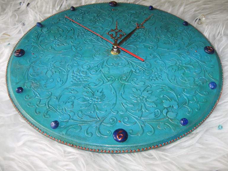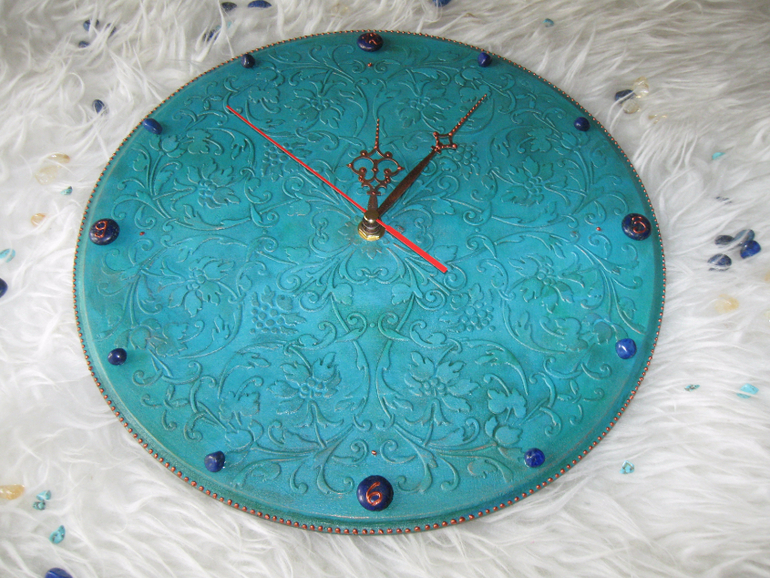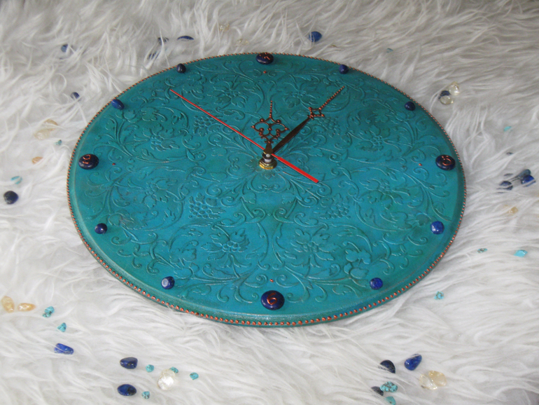 Такие часы прекрасно сочетаются с интерьером в бежево-коричневой, светло-бирюзовой, синей, зелёной гамме. Послужат красивым акцентом и разбавят надоевшие цвета красивой бирюзой.