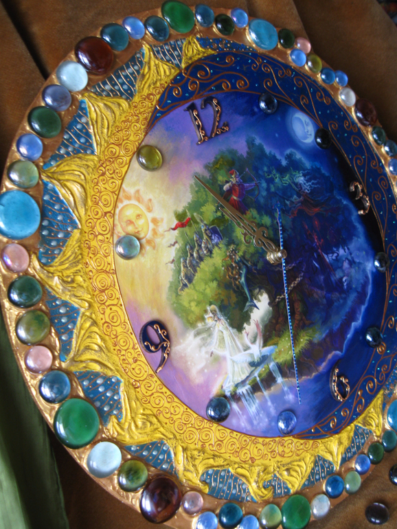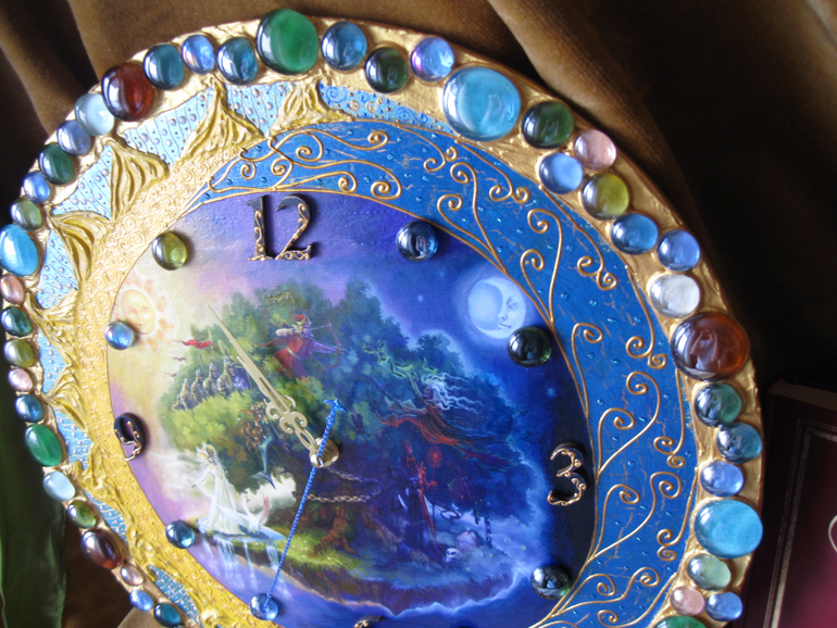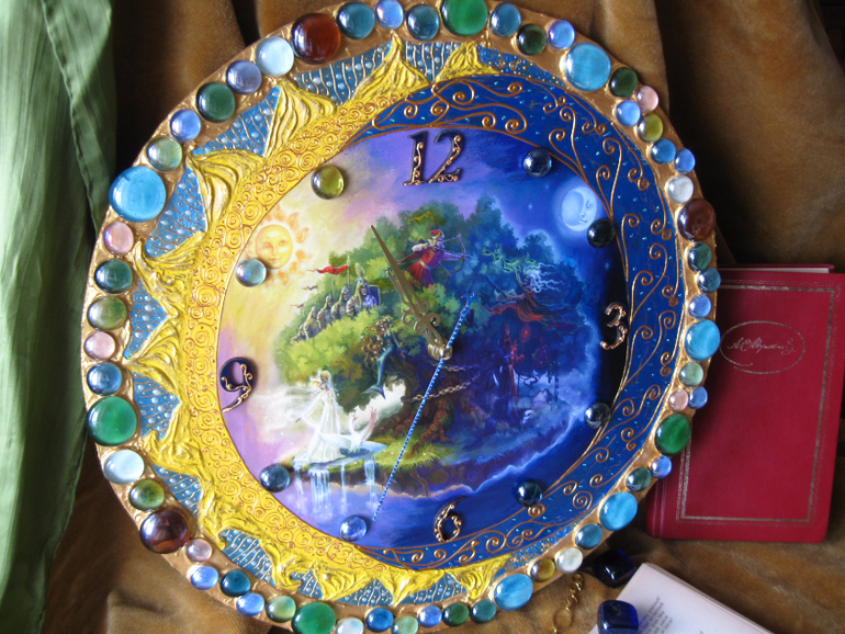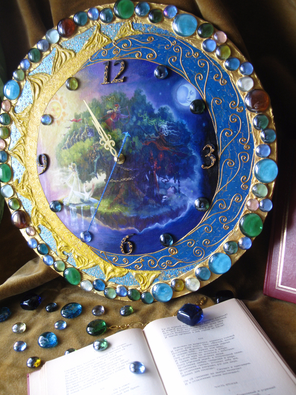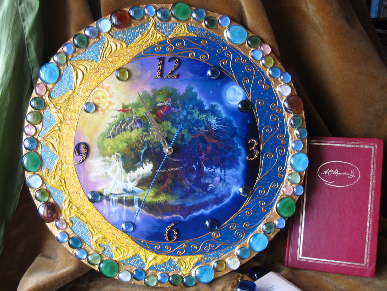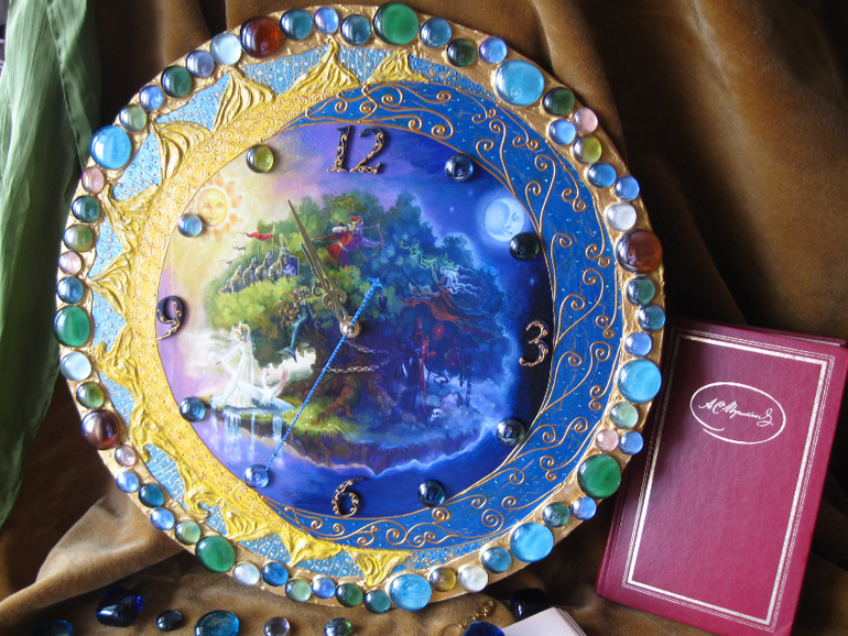 Часы в технике декупаж по мотивам знаменитого отрывка из всем известной поэмы А.С. Пушкина "Руслан и Людмила". Часы для всех возрастов, как и это бессмертное произведение.