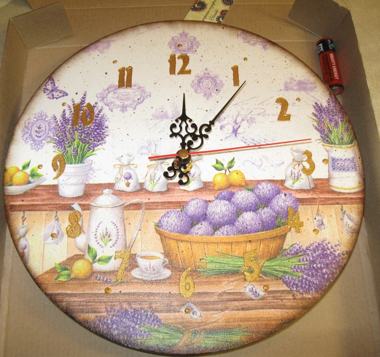 Часы декорированы в технике декупаж, оформлены в полном шарма стиле Прованс, таком уютном и домашнем. Такие часики внесут особую солнечную энергетику французской провинции в Ваш дом.