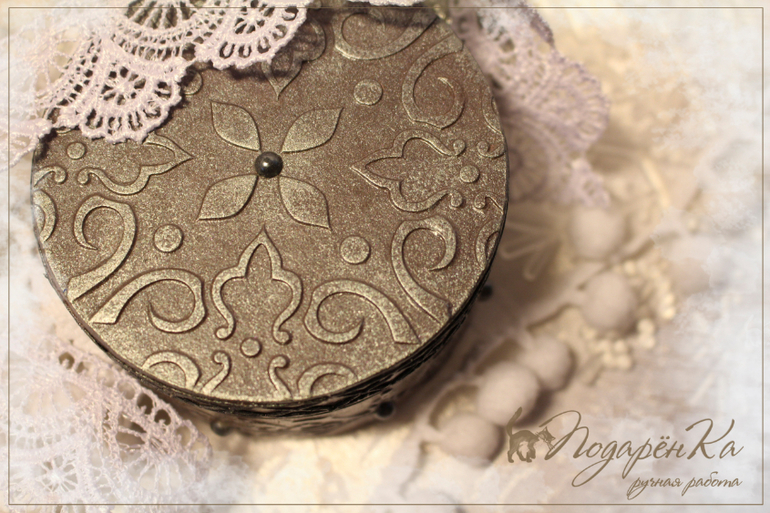 Скрапбукинг (альбомы, открытки и пр.)Здравствуйте) Хочу представить круглую шкатулку, диаметр 8см, высота 5см. Сделана полностью с нуля. Внутри бархатная ткань. В наличии.