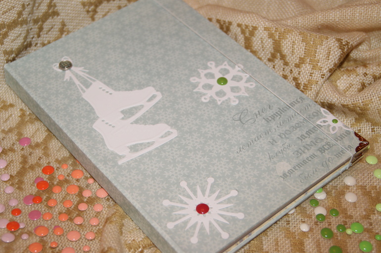 Формат А5. Листы не линованные. Можно делать зарисовки,а можно записывать что то нужное и важное. 120 листов.Обложка обклеена скрап бумагой,уголки защищены металлистическими уголками.Есть закладочка с милым снеговичком.Блокнот закрывается на резинку.Декор не объемный,что позволяет носить блокнот с собой в сумочке.