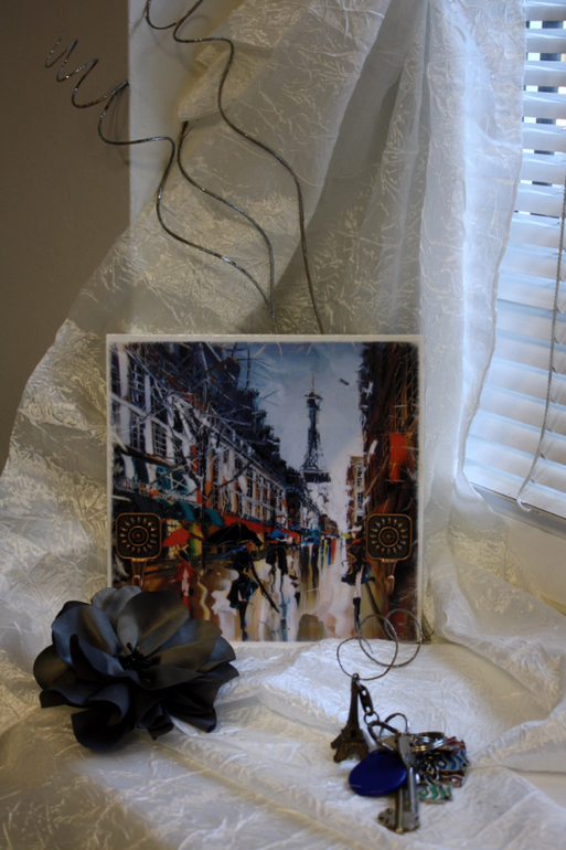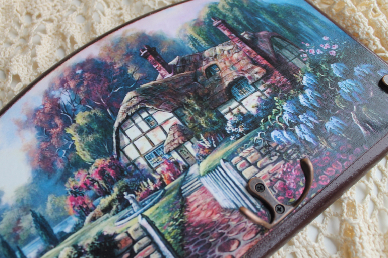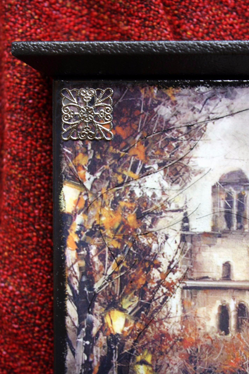 Материалы: панно, распечатка, акриловый грунт, акриловые краски, акриловый лак, ПВА, фурнитура.