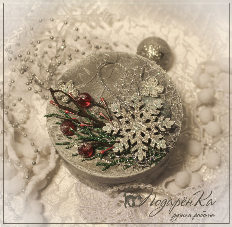 Круглая серебристая шкатулочка с новогодним декором. Украсит новогодний интерьер или будет замечательным подарком для Ваших близких!
