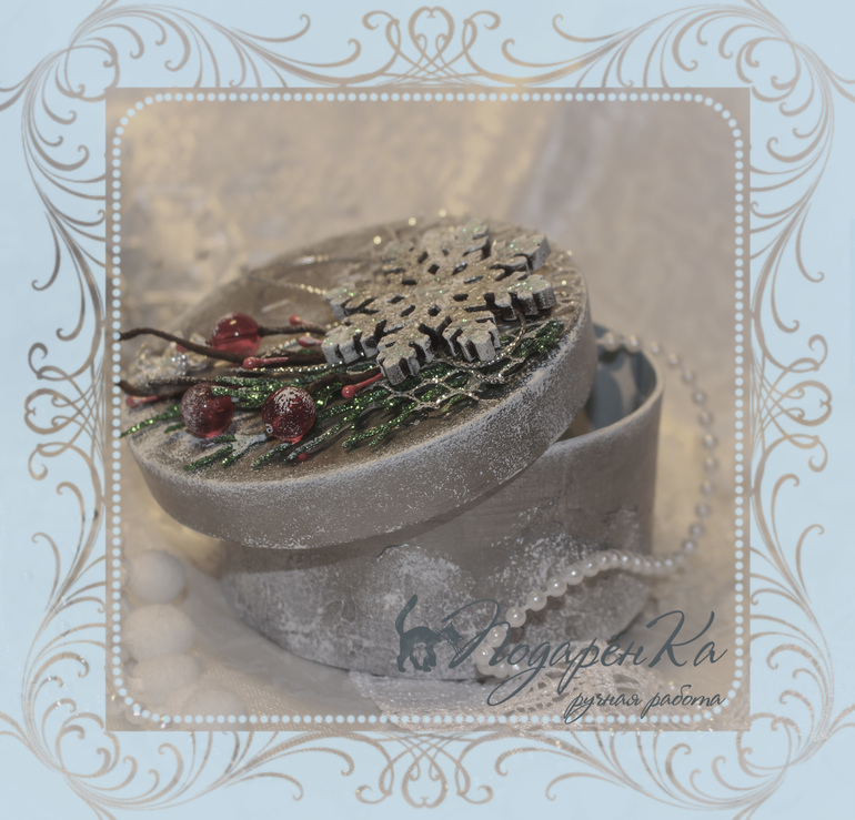 Скрапбукинг (альбомы, открытки и пр.)Круглая серебристая шкатулочка с новогодним декором. Украсит новогодний интерьер или будет замечательным подарком для Ваших близких!