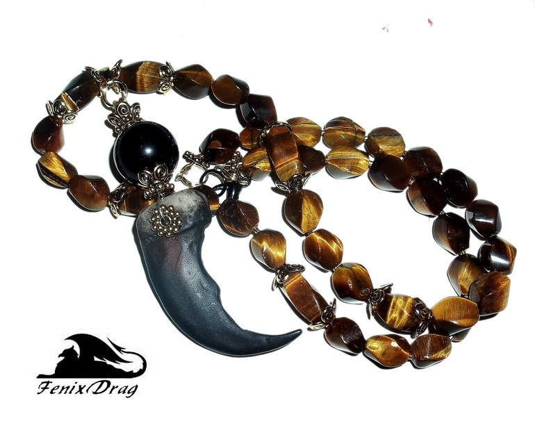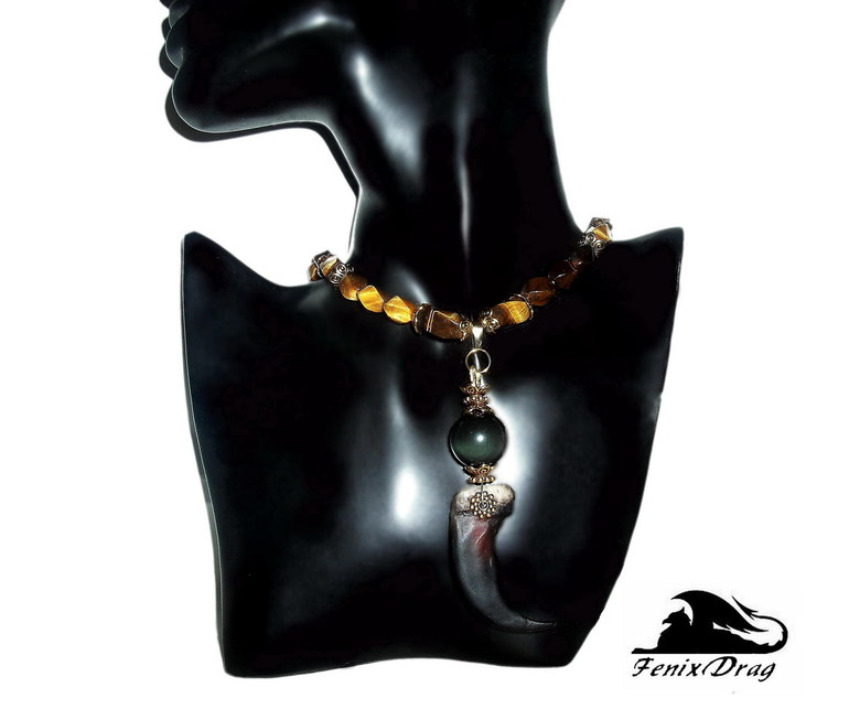 искусственный (синтетический) коготь медведя Гризли, тигровый глаз, радужный обсидиан, фурнитура под бронзу