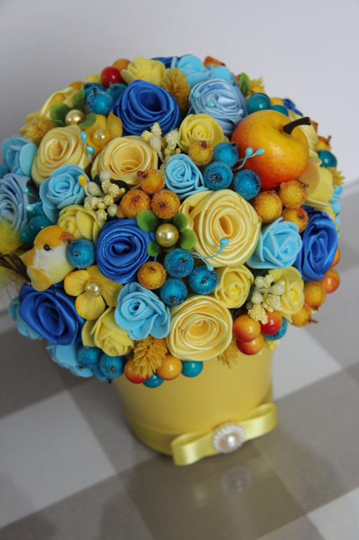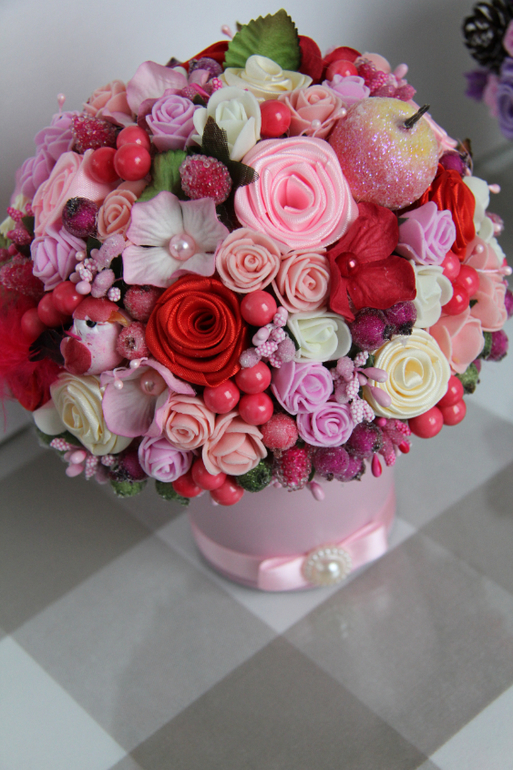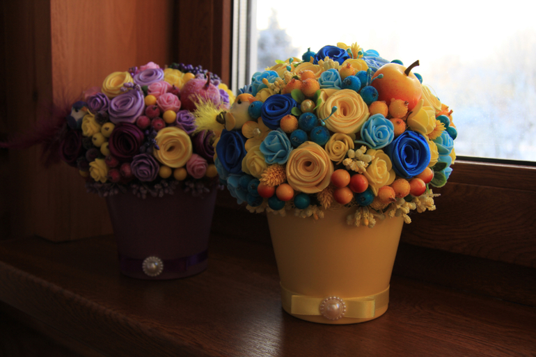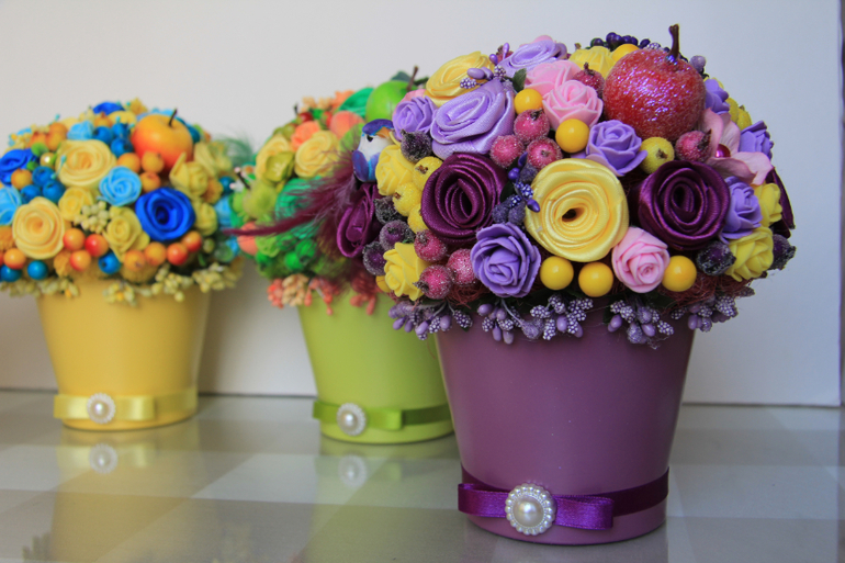 Спешите! Скоро "День святого Валентина" и "8 Марта". Чудесные, незабываемые и яркие горшочки с розочками из атласных лент и ягодками и фруктами. Очень сочные. Цена 1500р. Отправка в любые города РФ.