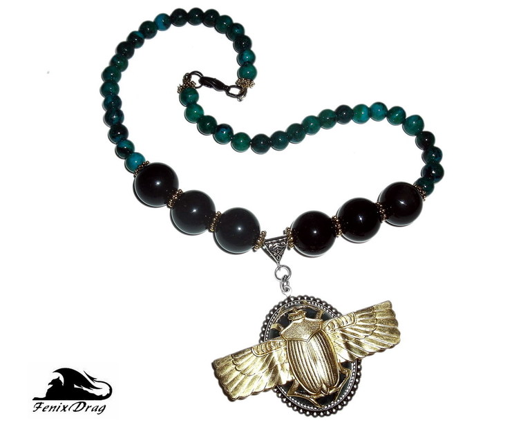 Колье "Золотой скарабей" с радужным обсидианом и хризоколлой