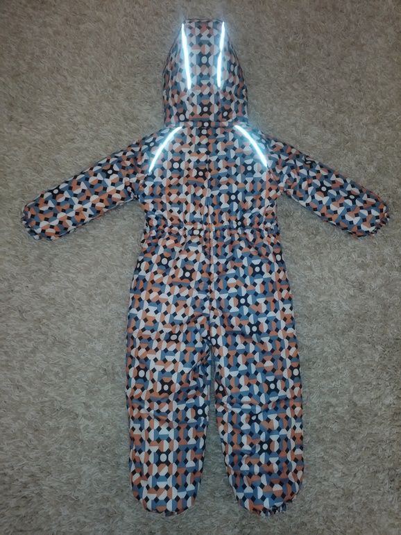 На спинке, по талии, кулиска с резинкой, регулируется фиксаторами и выведена вовнутрь комбинезона.
