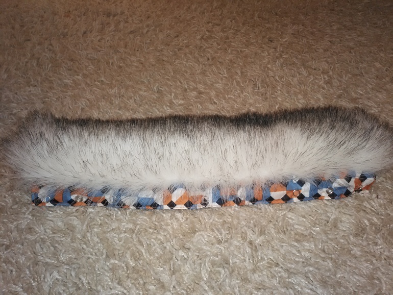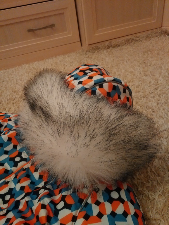 Капюшон съемный, пристегнут на молнию. Широкая опушка тоже съемная, на кнопках. Мех - искусственный песец, очень густой и пушистый :)