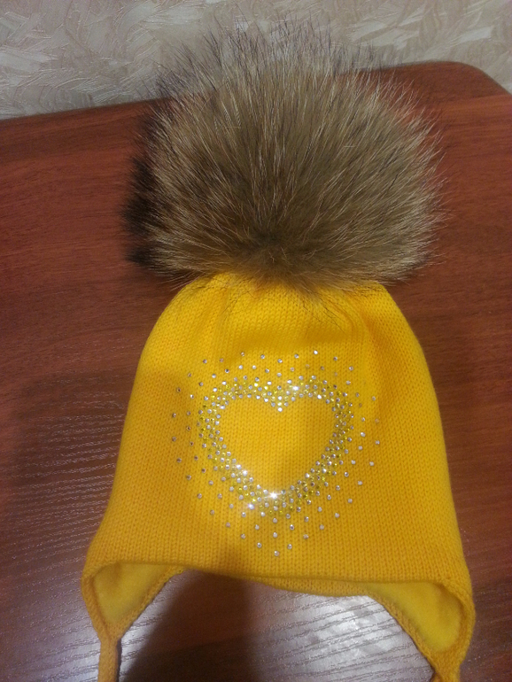 Шапочка ярко-желтая двойная с ушками и декором из страз "Сердце"