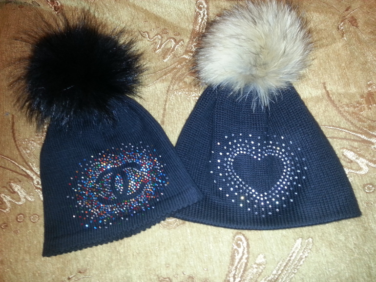 Шапочки двойные с ушками и без из мериносовой шерсти. Помпоны - натуральный енот, песец (съемный, на ленточках). Декор: картинки из страз, броши ручной работы.