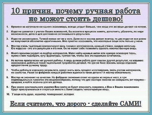 ХОРОШАЯ вещь не может стоить ДЕШЕВО. Любая из Вас с легкостью может высчитать примерную себестоимость каждого моего изделия (за работу я беру минимальную цену). И самое главное: ручная вязка - это индивидуальность, сравнимая с почерком. Особо это касается стразовых картинок, выкладываемых МНОЮ ВРУЧНУЮ по моим или Вашим эскизам (я могу снимать на видео процесс выкладки каждой картинки, если у кого-то возникнут сомнения в этом плане.., но это получится 5-6 часовой полнометражный фильм).