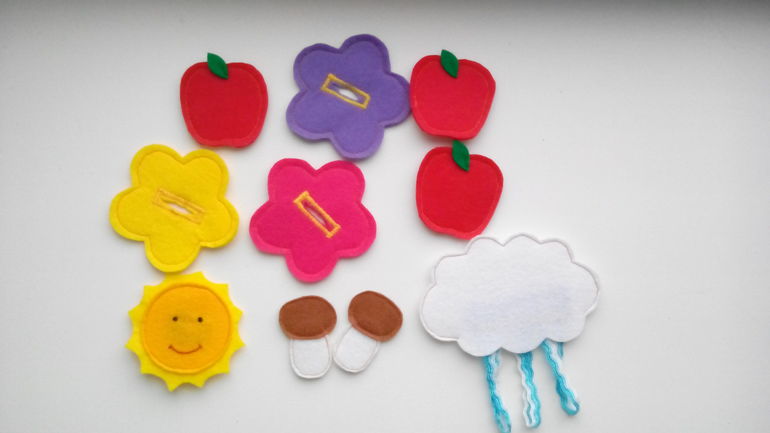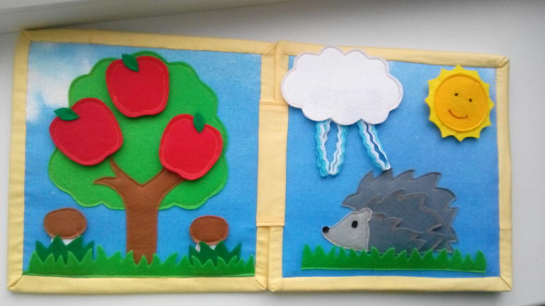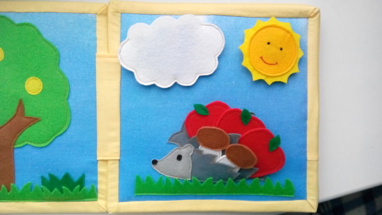 Яблочки на липучках, грибочки прячутся в травке-кармашках. Яблочки и грибочки собирает ежик (кармашки), Солнышко на кнопке, облачко/тучка на липучке.
