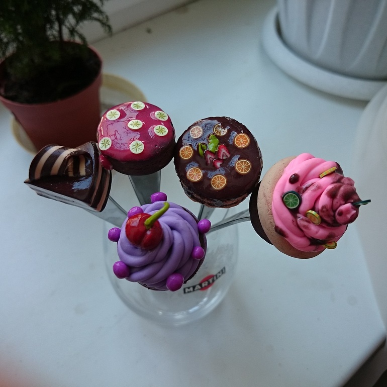 Чайные ложки производство Италия, длина 18 см, украшены мини-тортиками из полимерной глины.