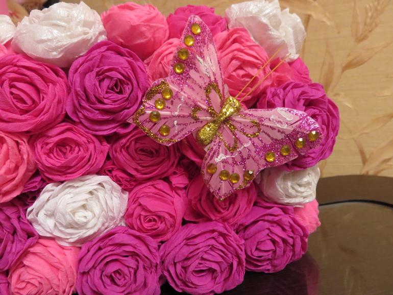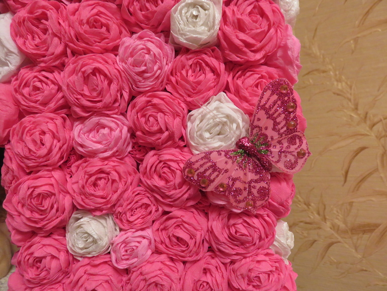 Оформление праздников, аксессуары для фотосессийОбьемная цфра 65*10 украшена более чем из 300 роз из гофрированной бумаги, каждый цветок выполнен в ручную, а так же украшена нежными бабочками.