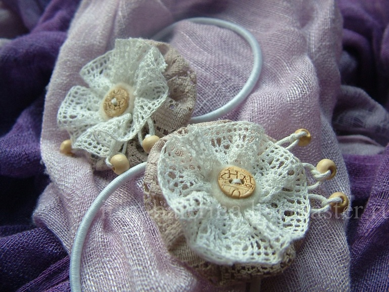 Бижутерия, броши, аксессуары для волосЭти небольшие резиночки для волос сшиты из гипюра, натурального хлопкового кружева и фетра. Украшены кокосовыми пуговичками, вощёным шнуром и деревянными бусинами.