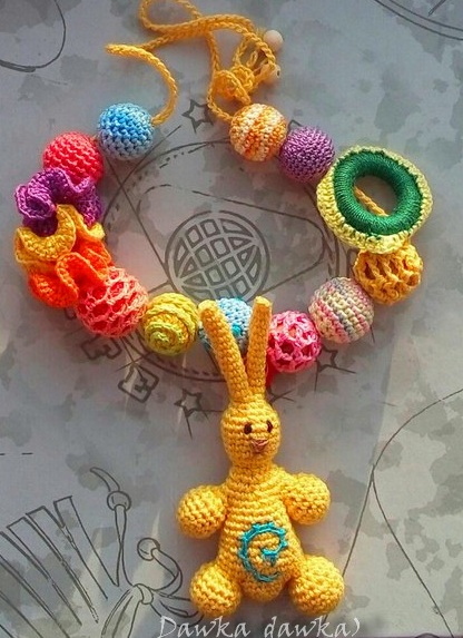 Бусины из дерева.Нитки Х\б. Сердечко погремушка.