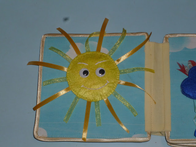 Задание на липучки. Слева крепится солнышко. лучики разной фактуры и подвижные глазки. Справа тучка. Фактурные ленточки - дождинки. Можно и наоборот) Тучка двухсторонняя - с одной стороны светлая улыбающаяся, с другой темная и хмурая. За тучкой прячется птичка)