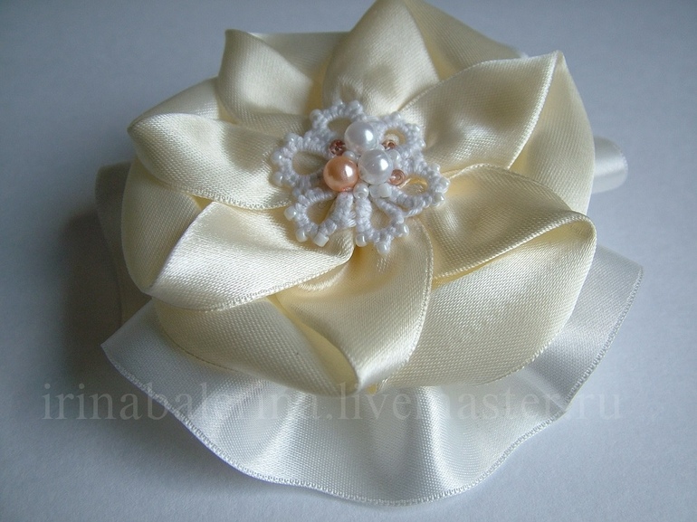 Бижутерия, броши, аксессуары для волосКлассический атласный бант из лент молочно-белого и кремового цвета, серединка - звездочка, сплетенная в технике фриволите с бисером. Бантик для волос полностью сшит без использования клея, резинка сшита из шляпной. По опыту мамы, имеющей дочку с косичками, убеждена: такое изготовление резинки для волос наиболее прочное и удобное.