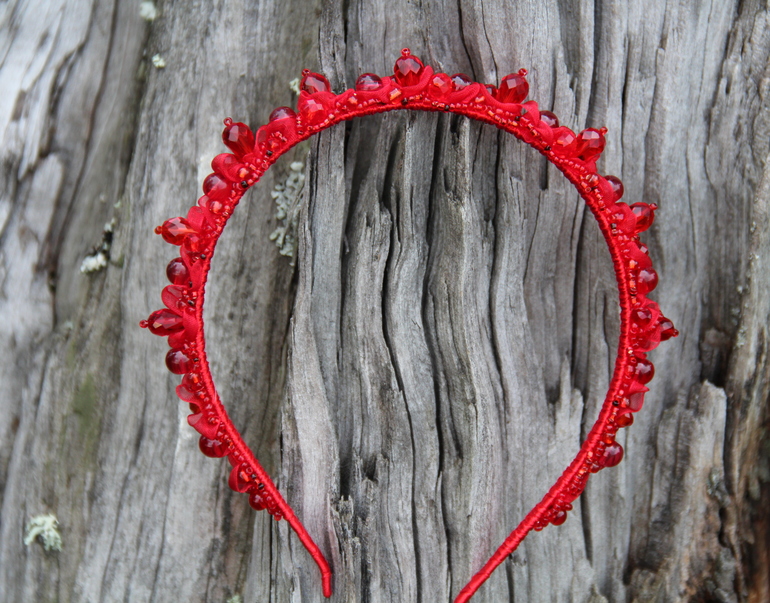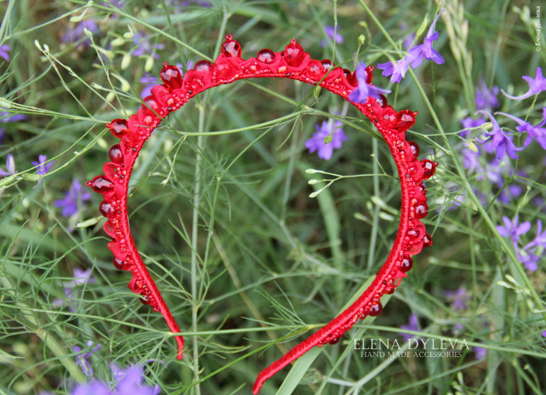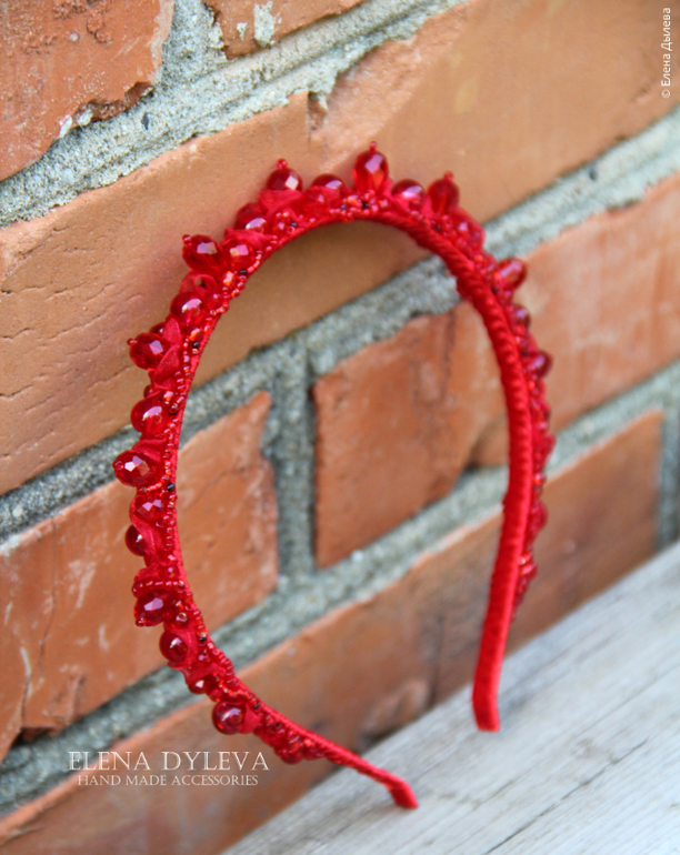 3) Сочный и праздничный ободок расшит бусинами и бисером красных оттенков. В работе использованы хрустальные бусины, чешский бисер, лента из органзы.