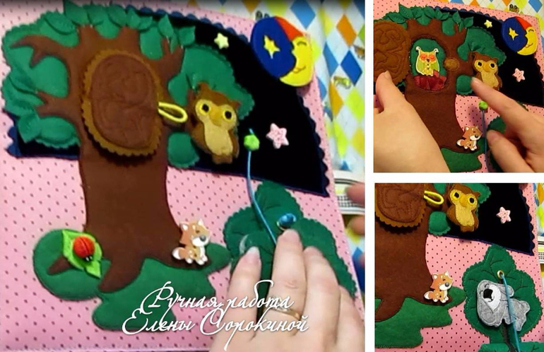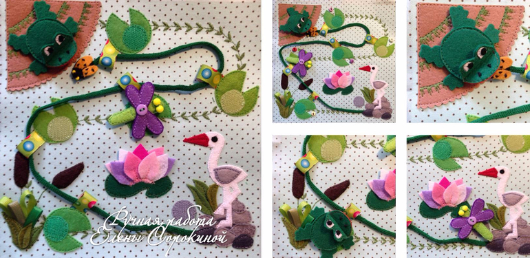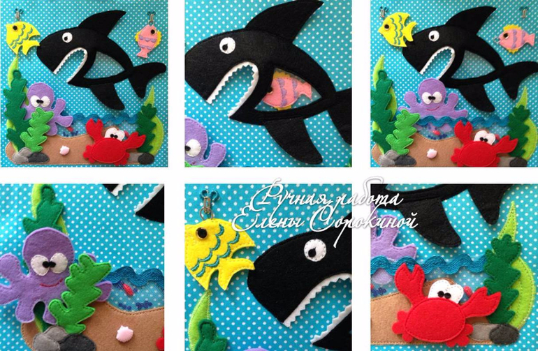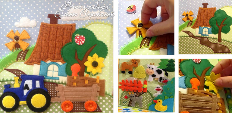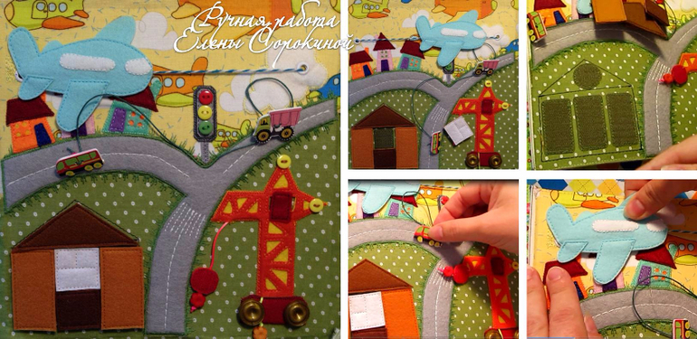 Книжка состоит их 14 страниц удобного формата 21х21 см. На переплете имеется ручка для переноса. Содержит около 80-ти съемных деталей. Некоторые странички заимствованы у других мастериц, есть и авторские детали, которые рождались в сотрудничестве с заказчицей и моим любимым сыночком, постоянно вносящем коррективы в мое творчество.