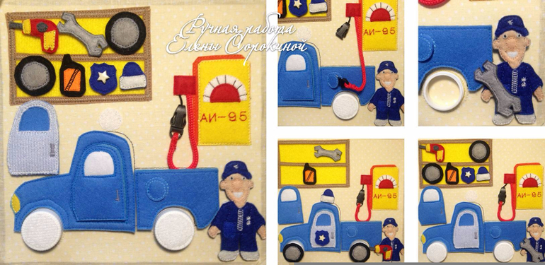 Представляю Вашему вниманию один из последних вариантов книжки для мальчиков. Книжка выполнена из качественных материалов: хлопок, корейский фетр, различная фурнитура. Такая книжка станет надежным спутником для вашего малыша в мир знаний и умений, поможет расширить словарный запас и развить мелкую моторику для еще ни столь ловких пальчиков. Далее видео и фото.