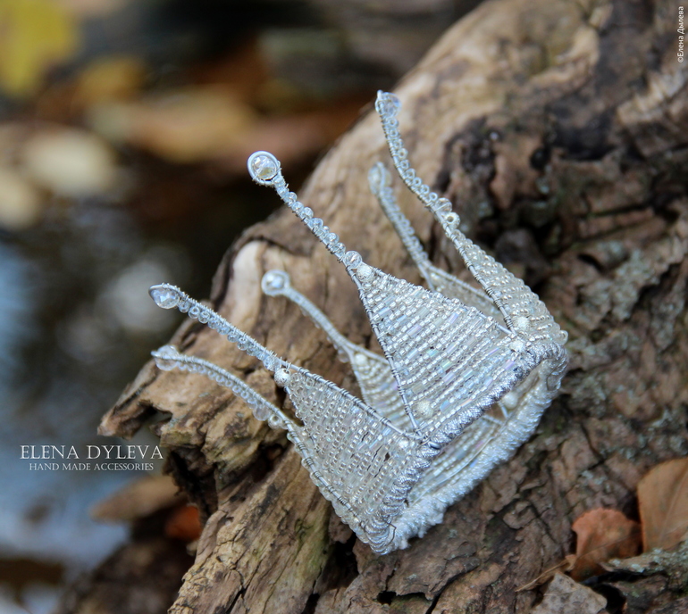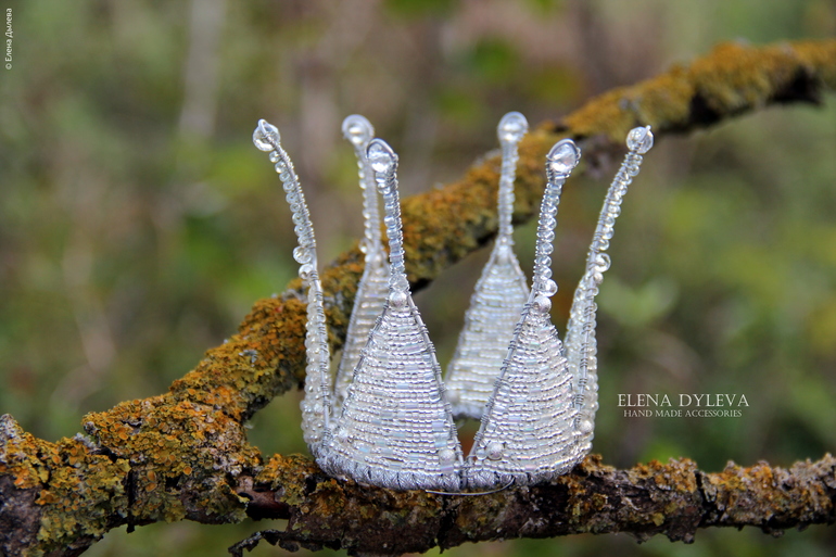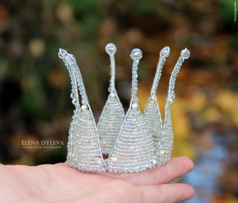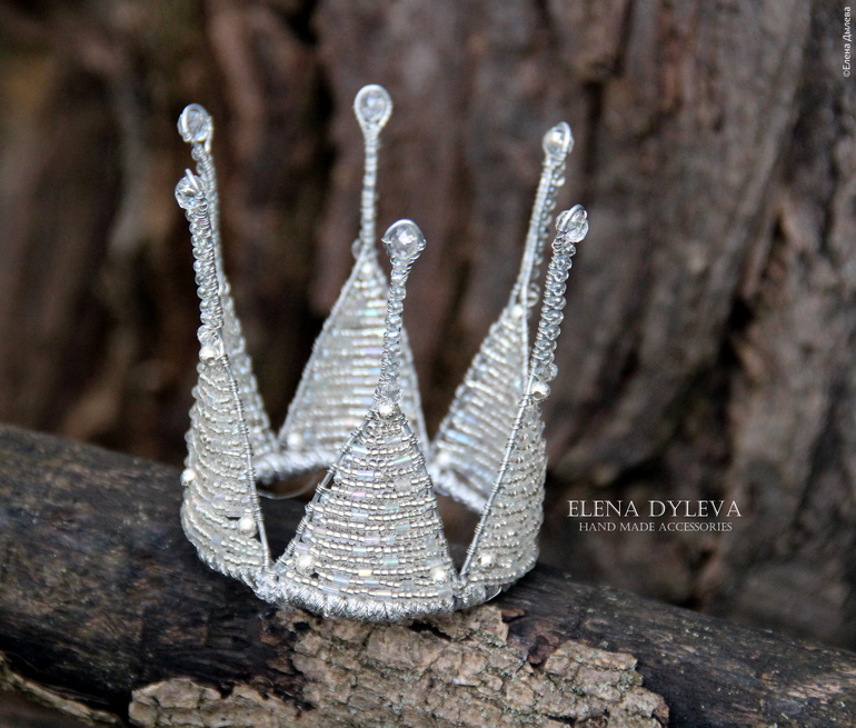 Бижутерия, броши, аксессуары для волосКорона имеет 6 звеньев. Выполнена из бусин и бисера белых - серебристых оттенков.