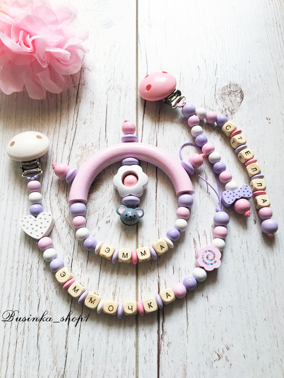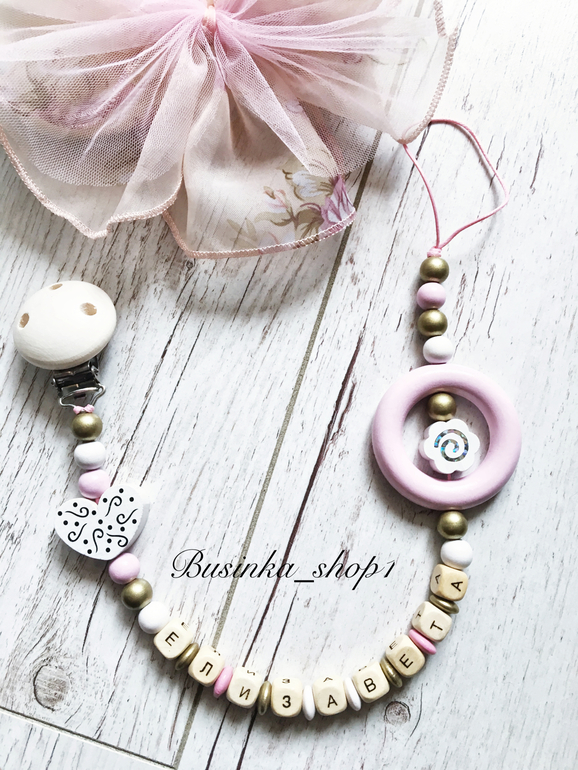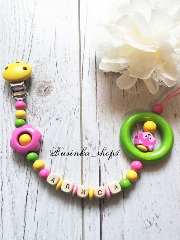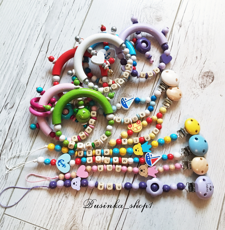 Развивающие игрушки и слингоаксессуарыBusinka_shop1 мастерская по изготовлению именных аксессуаров для малышей. Мы изготовим для ваших малышей именные держатели для пустышки/грызунка, именные погремушки, брелоки, подвески на рюкзачок, браслеты и бусы. Вся фурнитура европейского производства, выполненная из натурального дерева, со слюноотталкивающим покрытием. Детали аксессуаров имеют закруглённые углы, а нетоксичный стойкие краски на водной основе безопасны для самых маленьких. Именной держатель или погремушка предназначены для прорезывания зубов, развития мелкой моторики, изучения цвета и форм. Наши изделия станут памятным подарком для ваших малышей. Индивидуальный подход к каждому покупателю, возможность придумать собственный дизайн или выбрать из уже имеющихся. Все изделия изготавливаются в ручную, в любом дизайне и цвете.